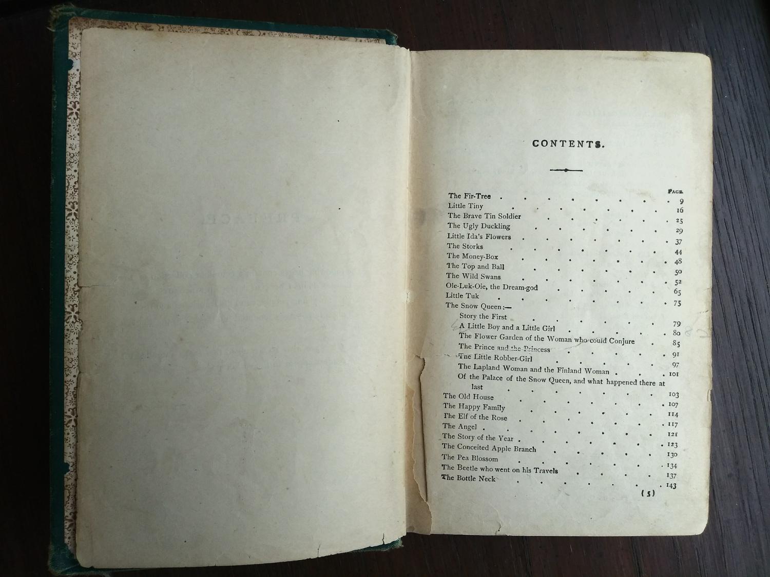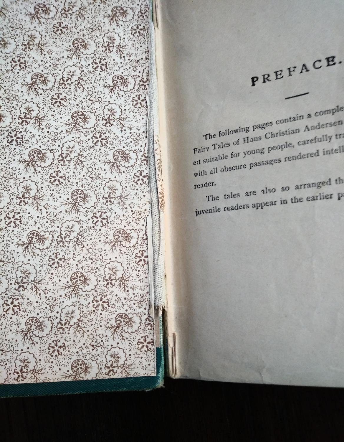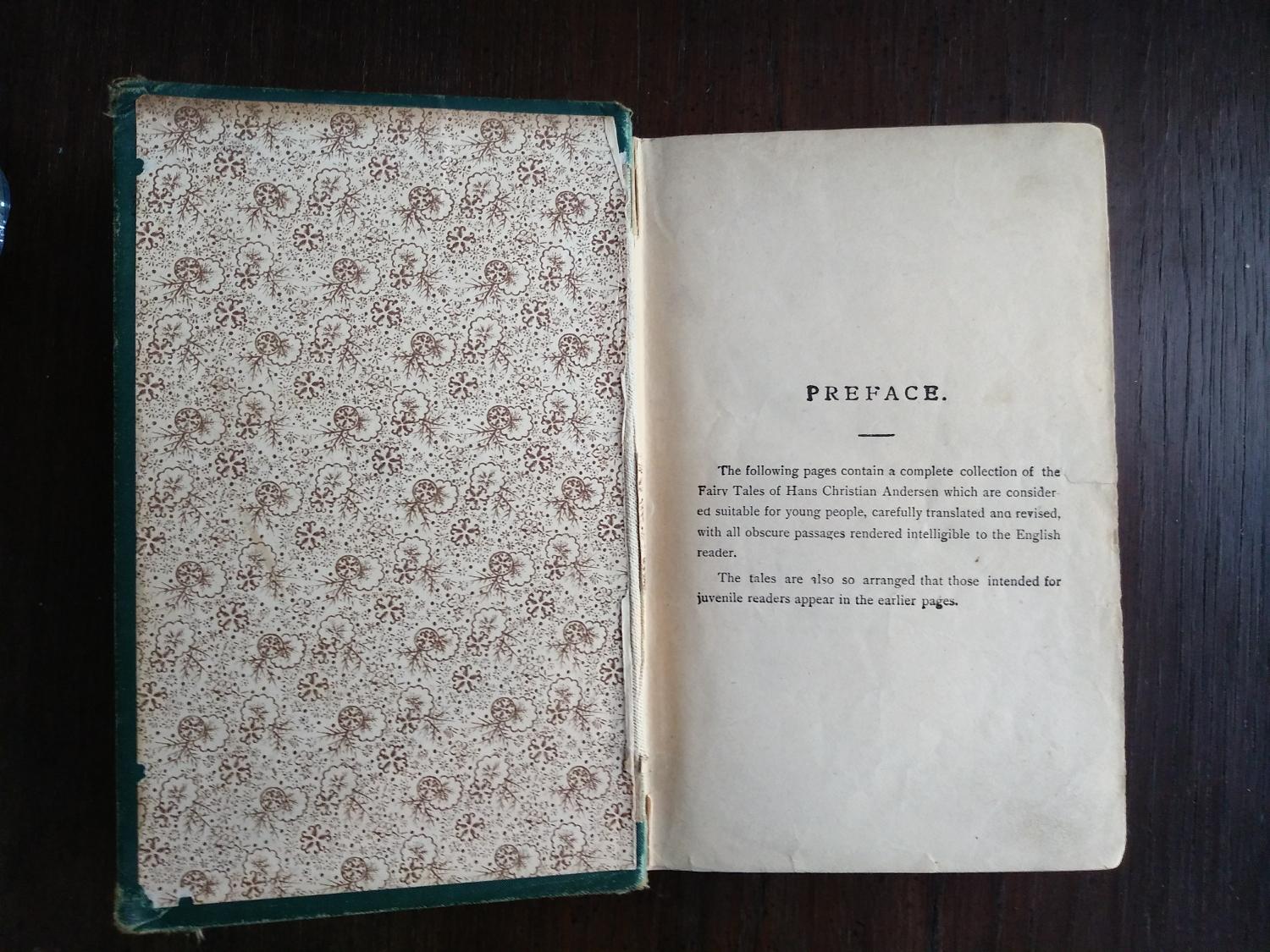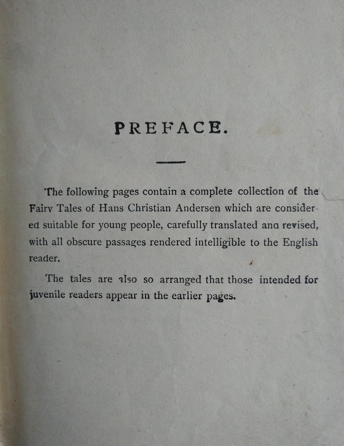 The opening of the preface reads: “The following pages contain a complete collection of the Fairy Tales of Hans Andersen which are considered suitable for young people, carefully translated and revised, with all obscure passages rendered intelligible to the English reader”.