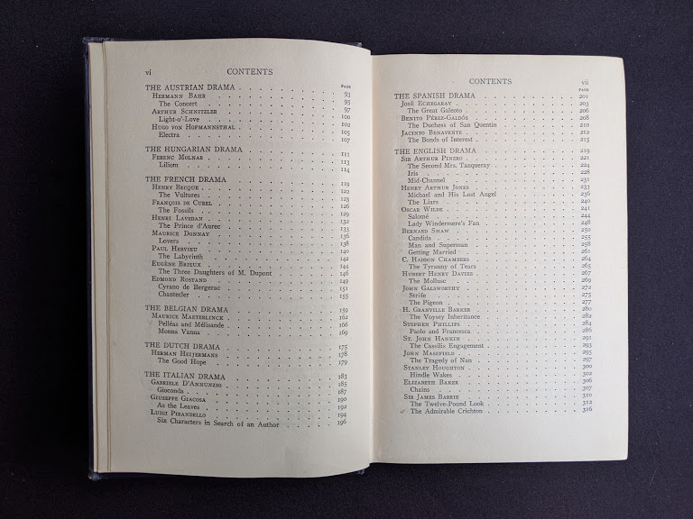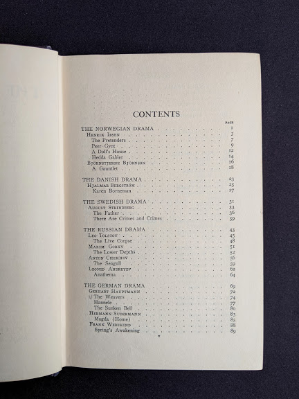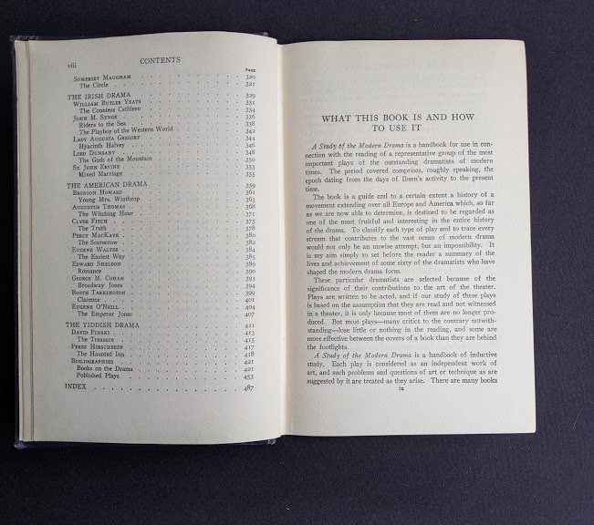 Contents: What this Book is and How to Use It. 1. The Norwegian Drama: The Pretenders. Peer Gynt. A Doll’s House. Hedda Gabler. Bjornstjerne Bjornson. A Gauntlet. 2. The Danish Drama: Hjalmar Bergstrom. Karen Borneman. 3. The Swedish Drama: August Strindberg. The Father. There are Crimes and Crimes. 4. The Russian Drama ( Before the Revolution): Leo Tolstoy: The Live Corpse. Maxim Gorky: The Lower Depths. Anton Chekhov: The Seagull. Leonid Andreyev: Anathema. 5. The German Drama: Gerhart Hauptmann: The Weavers. Hannele. The Sunken Bell. Frank Wedekind: Spring’s Awakening. 6. The Austrian Drama: Hermann Bahr: The Concert. Arthur Schnitzler: Light O Love. Hugo Von Hofmannsthal: Electra. 7. The Hungarian Drama: Ferenc Molnar: Liliom. 8. The French Drama: Henry Becque: The Vultures. Francois De Curel: The Fossils. Henri Lavedan: The Prince of d’Aurec. Maurice Donnay: Lovers. Paul Hervieu: The Labyrinth. Eugene Brieux: The Three Daughters of M. Dupont. Edmond Rostand: Cyrano De Bergerac. Chantecler. 9. The Belgian Drama: Maurice Maeterlinck: Pelleas and Melisande. Monna Vanna. 10. The Dutch Drama: Herman Heijermans: The Good Hope. 11. The Italian Drama: 12. The Spanish Drama: 13. The English Drama: Sir Arthur Pinero: The Second Mrs. Tanqueray. Iris. Mid Channel. Henry Arthur Jones: Michael and His Lost Angel. Oscar Wilde: Salome. Lady Windermere’s Fan. Bernard Shaw: Candida. Man and Superman. Getting Married. C. Haddon Chambers: The Tyranny of Tears. Hubert Henry Davis: The Mollusc. John Galsworthy: Strife. Pigeon. etc. etc. 14. The Irish Drama: William Butler Yeats: The Countess Cathleen. John M. Synge: Riders to the Sea. The Playboy of the Western World. Lady Augusta Gregory: Hyacinth Halvey. Lord Dunsany: The Gods of the Mountain. Sir James Ervine: Mixed Marriage. 15. The American Drama: Bronson Howard: Young Mrs. Winthrop. Augustus Thomas: The Witching Hour. Clyde Fitch: The Truth. Percy Mackayne: The Scarecrow. Eugene Sheldon: The Easiest Way. George M. Cohan: Broadway Jones. Booth Tarkington: Clarence. Eugene O’Neill: The Emperor Jones. 16. The American Drama 1928-1938. 17. The Yiddish Drama: David Pinski: The Treasure. Peter Hirschbein: The Haunted Inn. 18. The Drama of Soviet Union. Bibliography. Index.