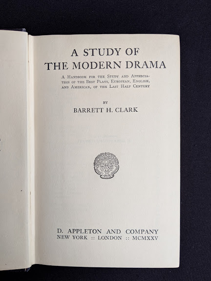 Study of Modern Drama by Barrett H. Clark. A Handbook for the Study and Appreciation of Typical Plays, European, English and American of the Last Three Quarters of a Century. Published in New York by D. Appleton and Company, 1925. First Edition.
