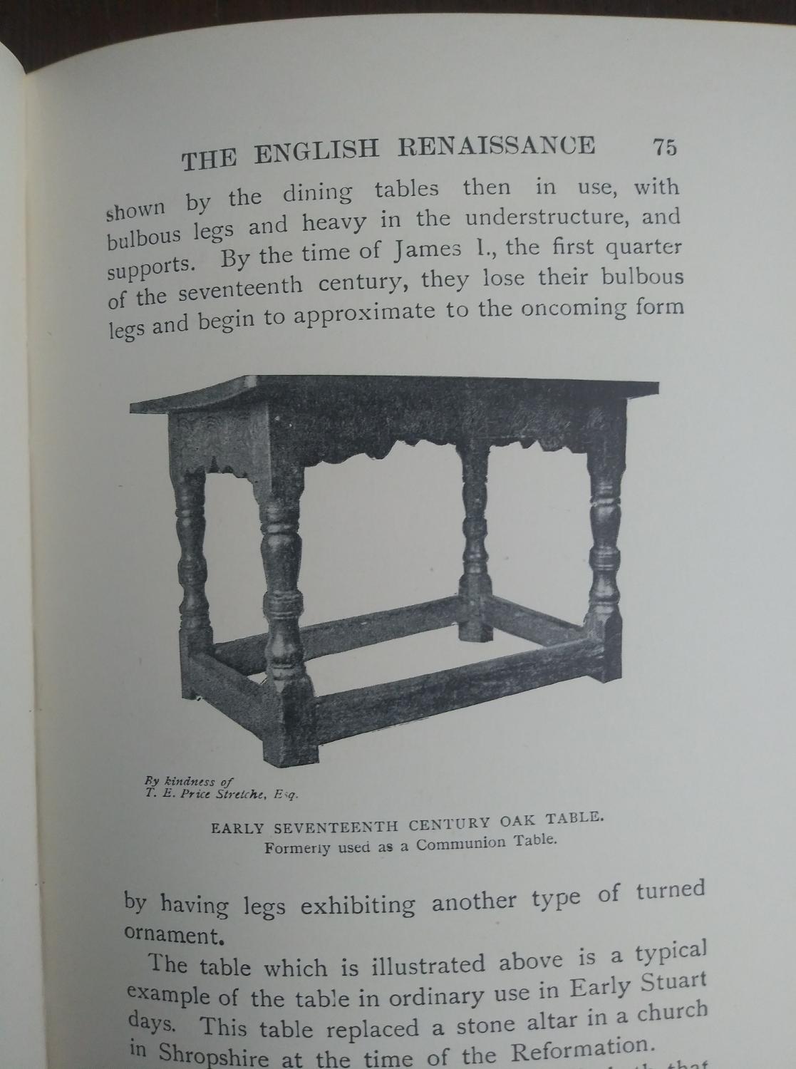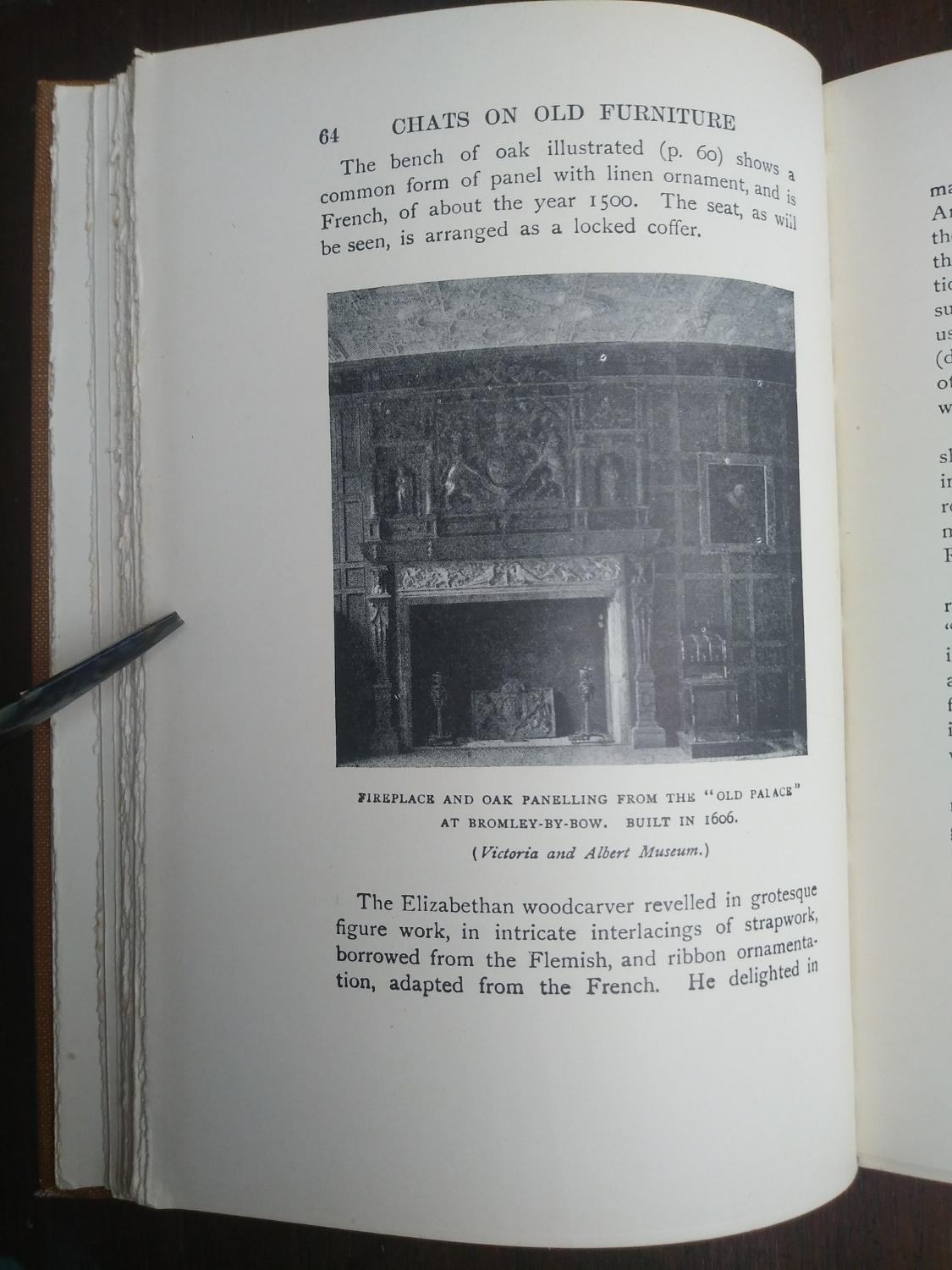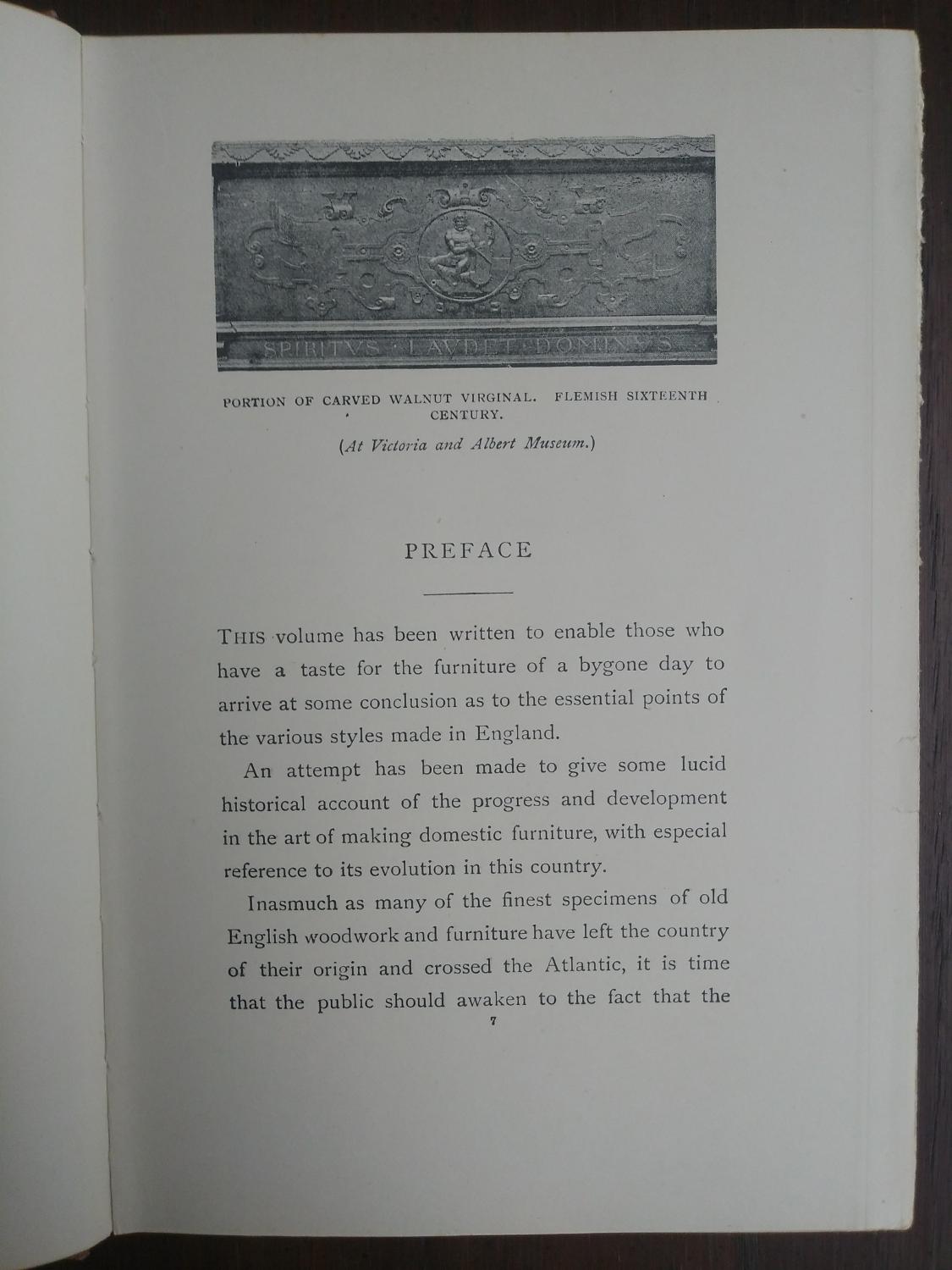 The Preface reads: “This home furnishing volume has been written to enable those who have a taste for the furniture of a bygone day to arrive at some conclusion as to the essential points of the various styles made in England. An attempt has been made to give some lucid historical account of the progress and development in the art of making domestic furniture, with especial reference to its evolution in this country”.