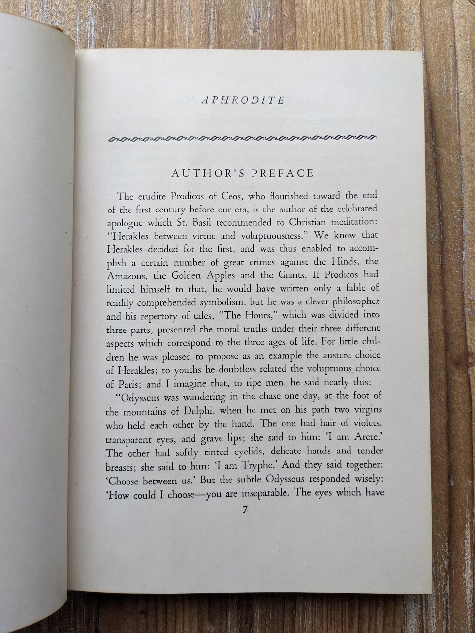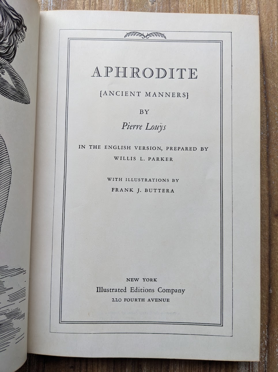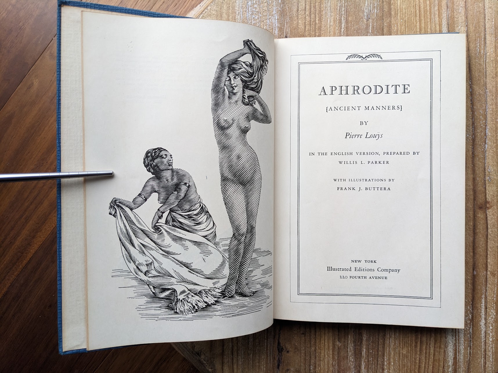 Aphrodite {Ancient Manners} by Pierre Louÿs. Published 1932 in New York by by Illustrated Editions Co. Illustrations by F.J. Buttera. Translated by Willis L. Parker. (Fiction).