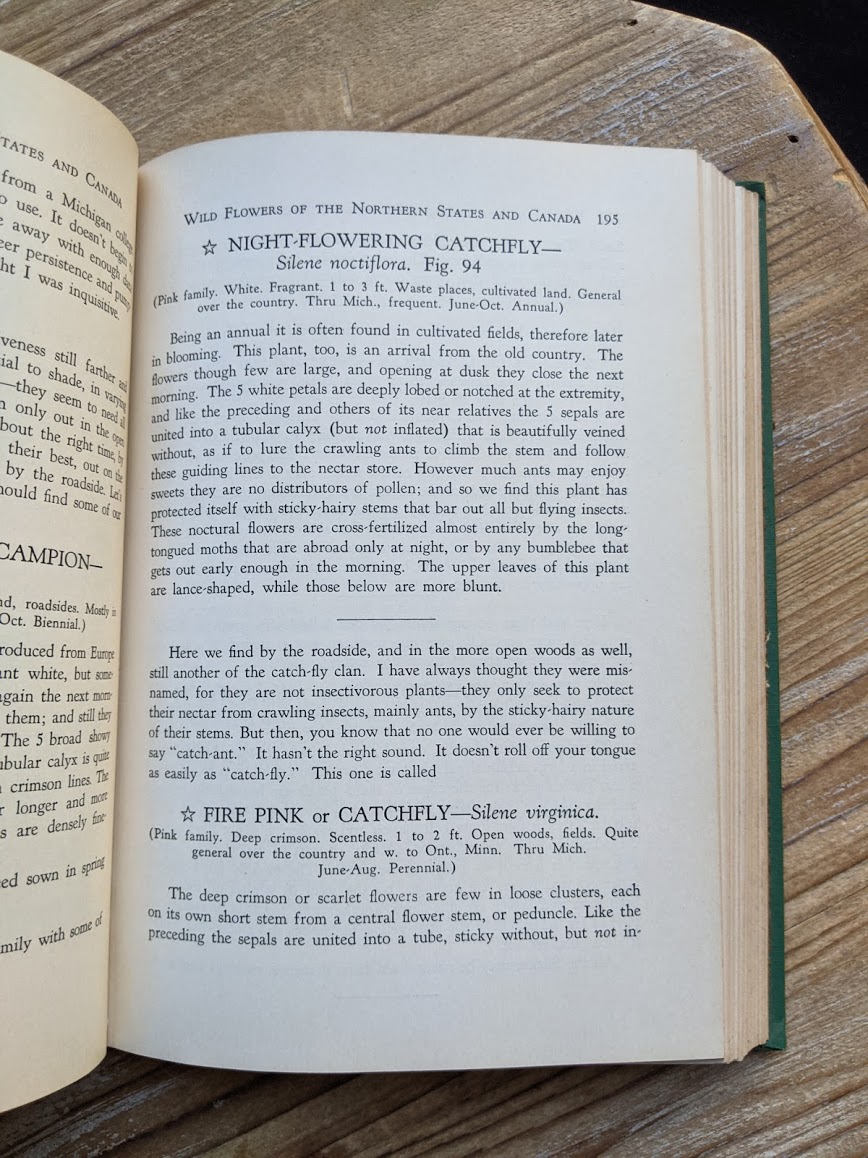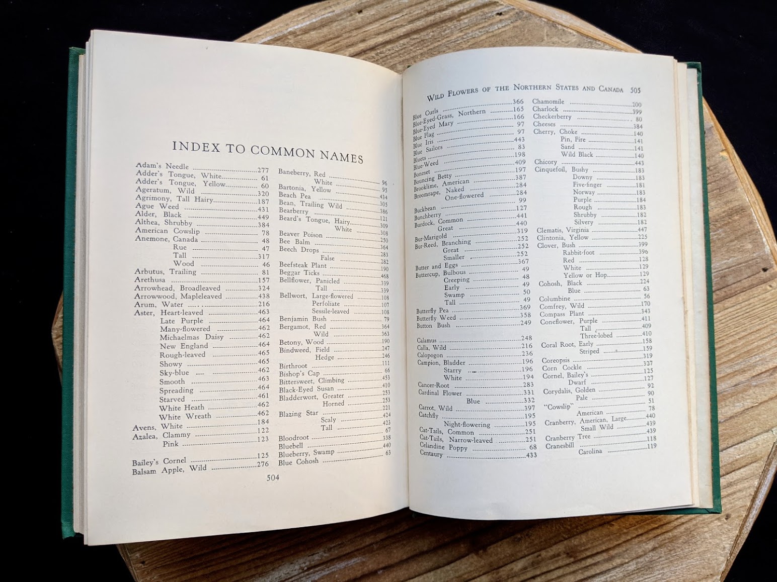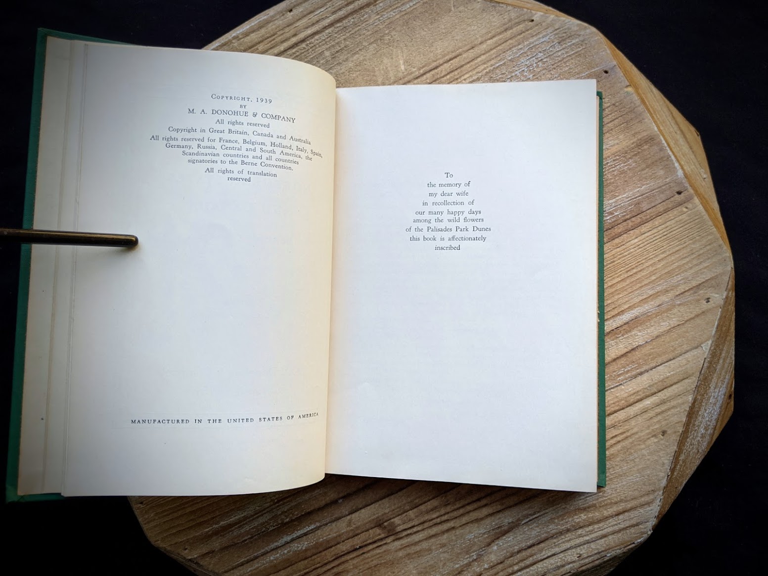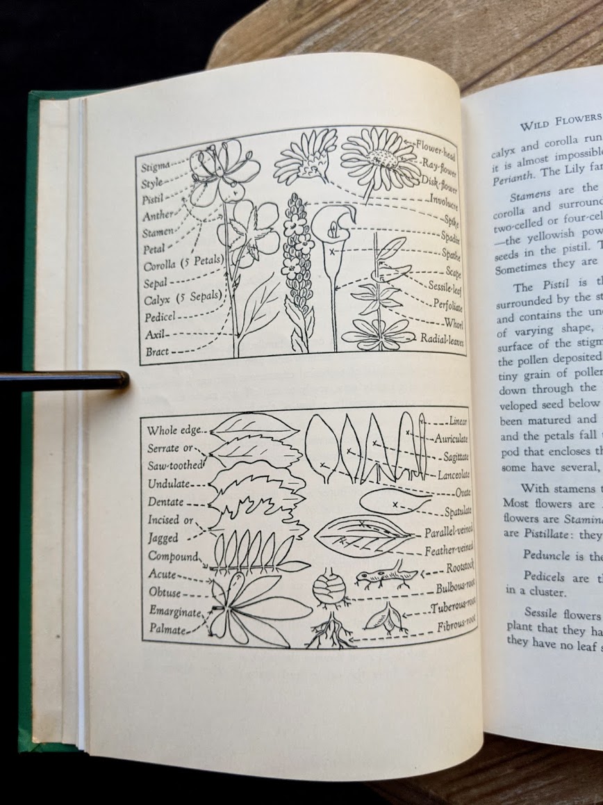 Eight Color Plates, A non-technical illustrated work on wild flowers covering some 600 species with all related subjects. Life Cycles, habits, traits, haunts, range, frequency, and pollination of wild Flowers are explained. There is a full index in back for both Common Names and Scientific Names. 518 pages. Book is in beautiful condition, all pages clean and secure to hinge, green cloth boards are still vibrant. Gold gilt title on front panel and spine.