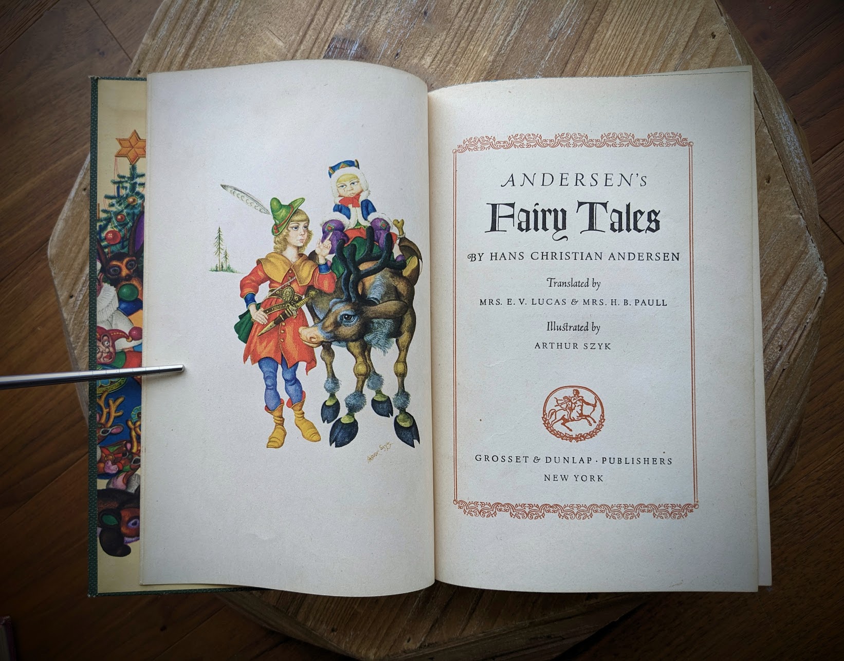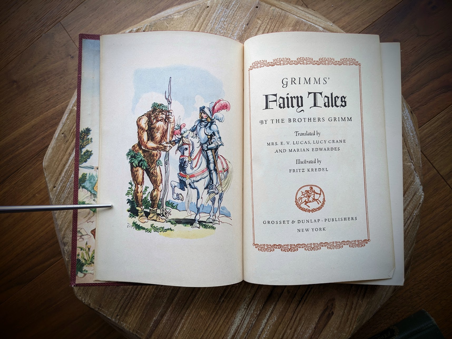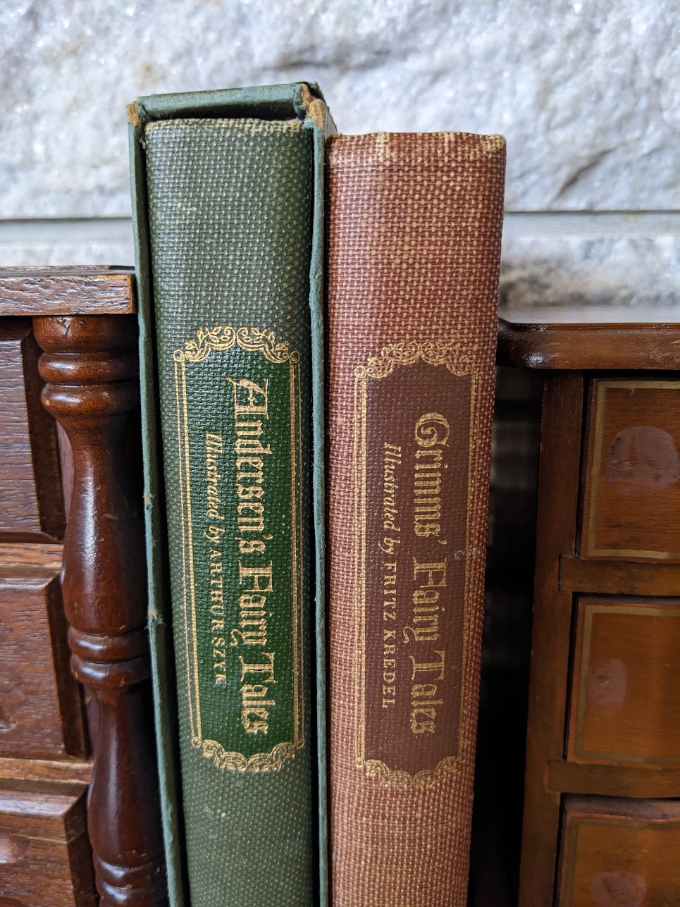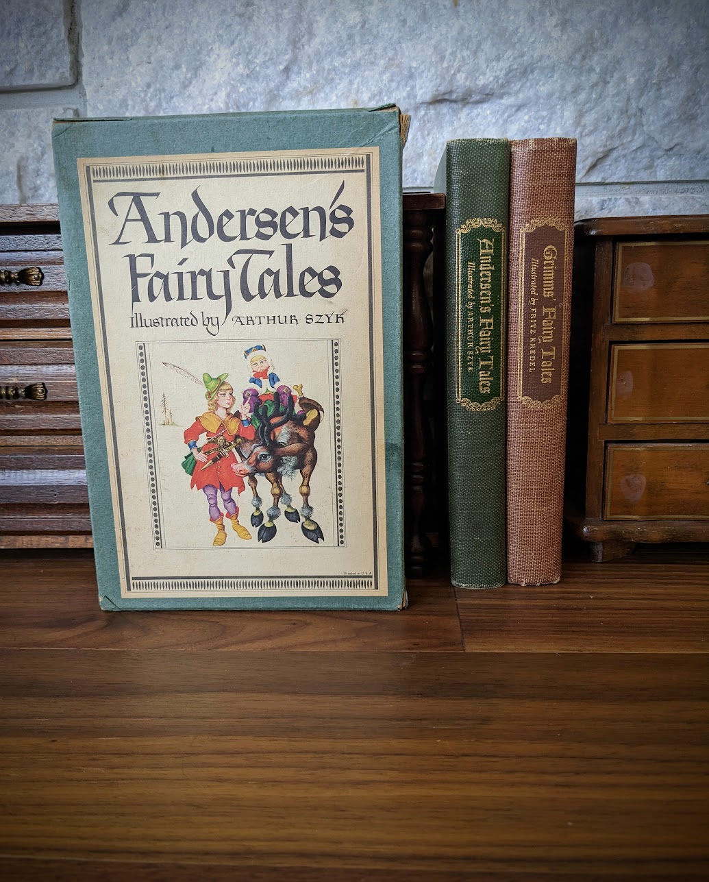 1- Andersen’s Fairy Tales by Hans Christian Andersen. Illustrated by Arthur Szyk. Green cloth hardcover; 343 pages. 2- Grimm’s Fairy Tales by the Brothers Grimm. Illustrated by Fritz Kredel. Red cloth hardcover; 373 pages. Publisher: Grosset & Dunlap. Copyright 1945. First Editions.