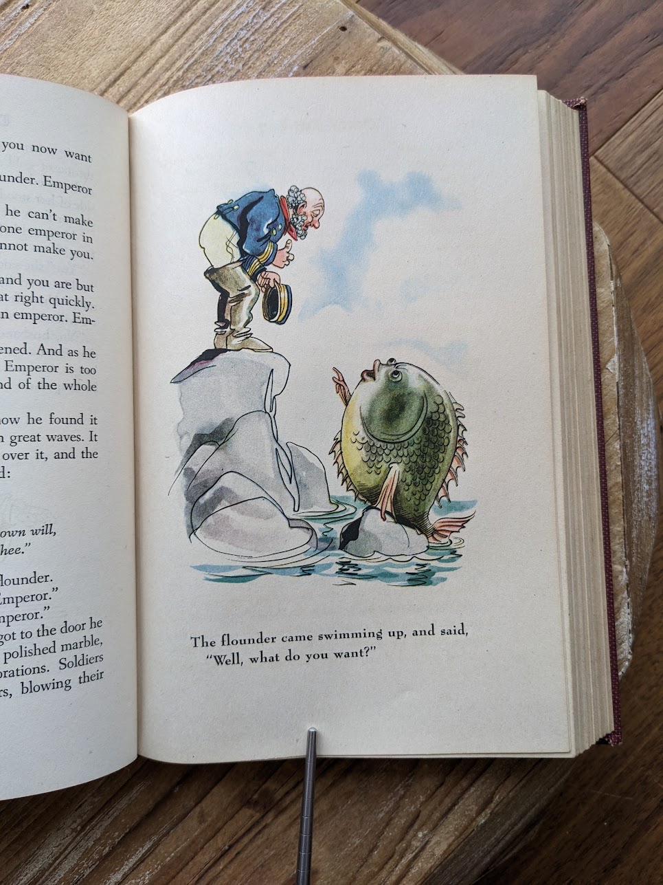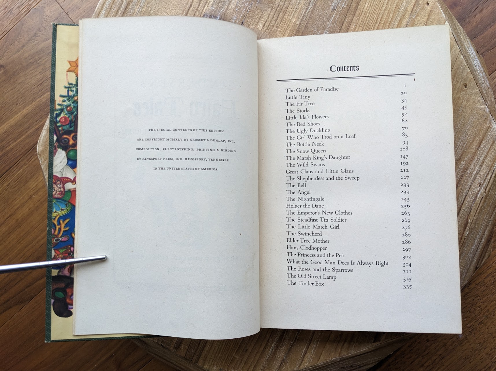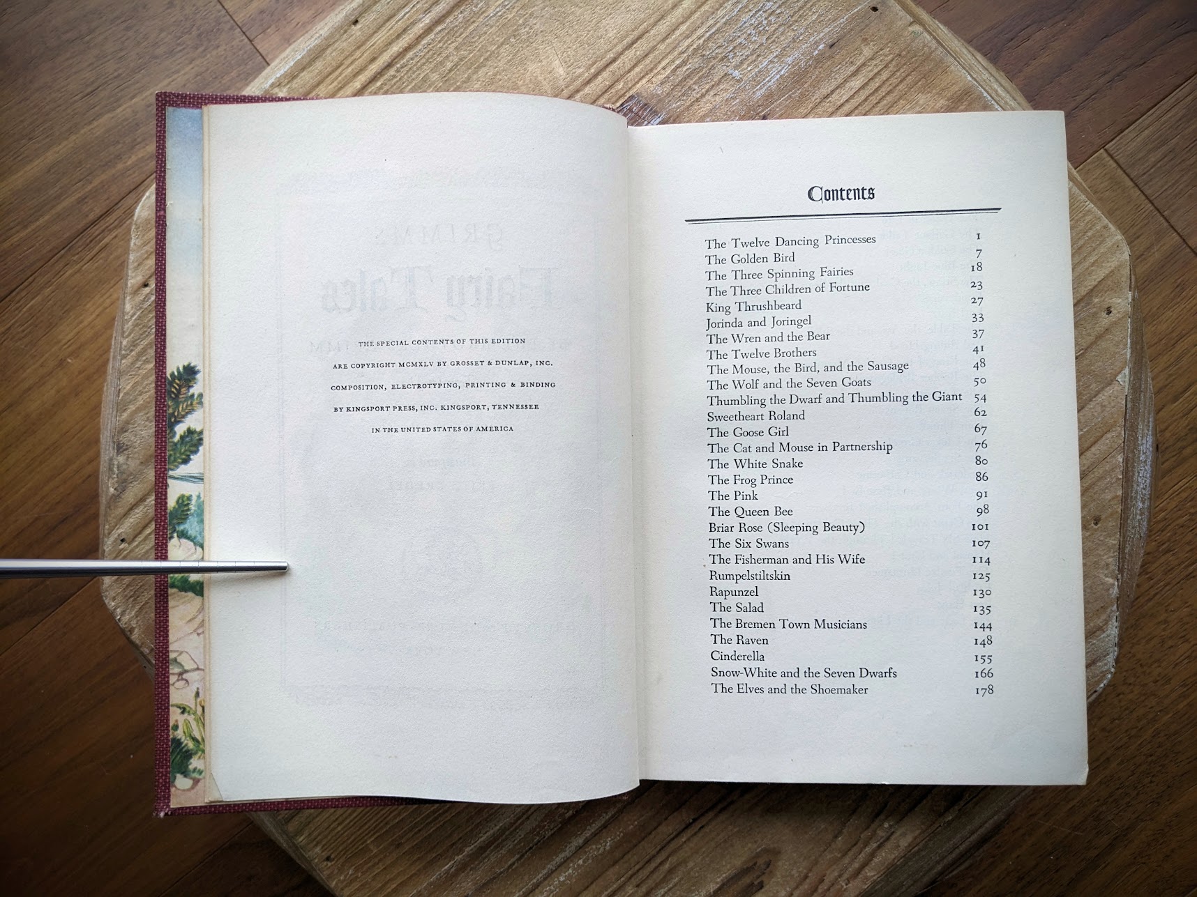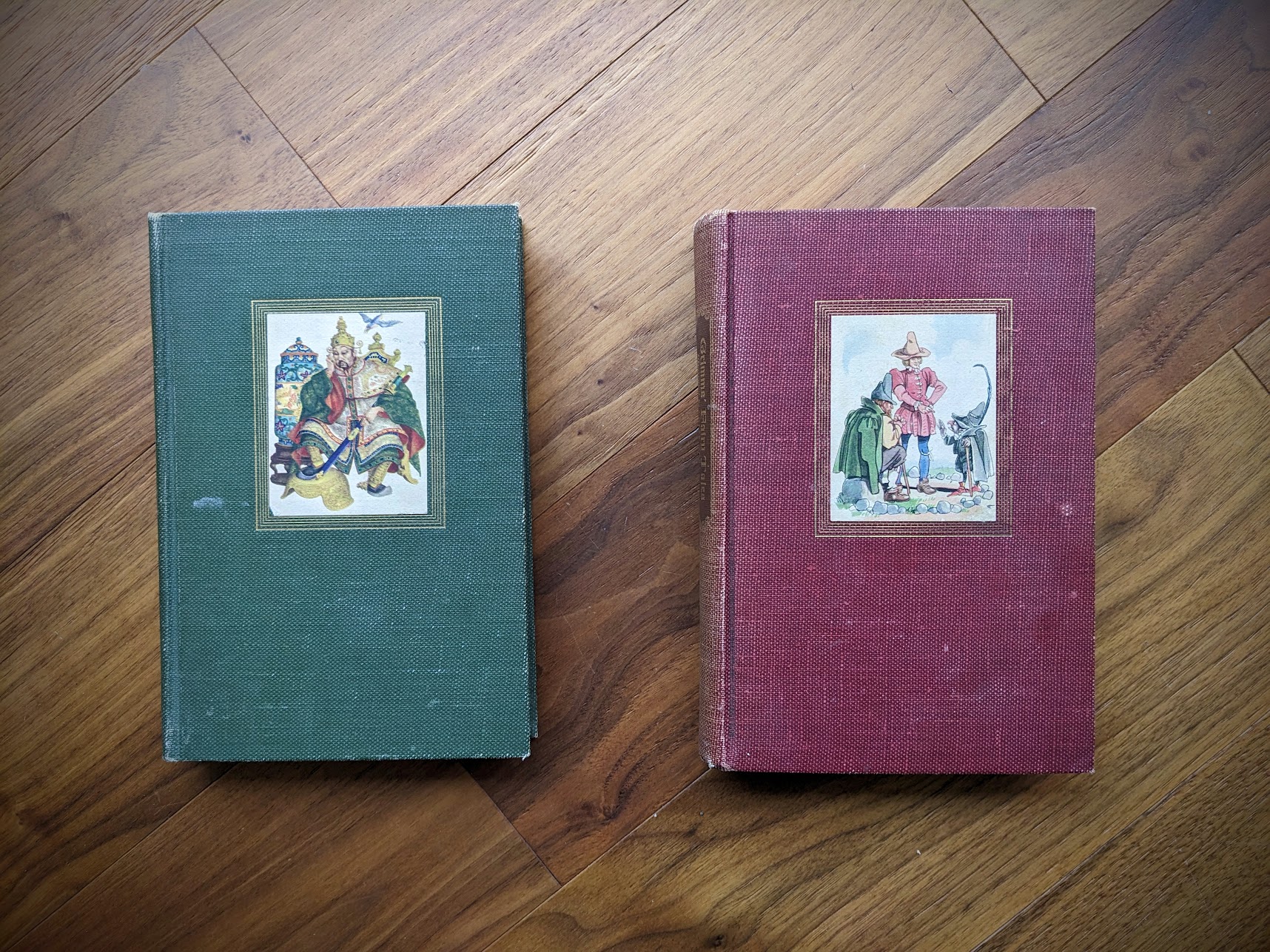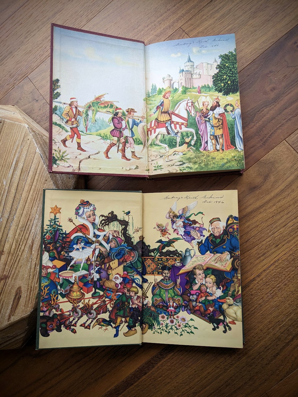 1- Andersen’s Fairy Tales by Hans Christian Andersen. Illustrated by Arthur Szyk. Green cloth hardcover; 343 pages. 2- Grimm’s Fairy Tales by the Brothers Grimm. Illustrated by Fritz Kredel. Red cloth hardcover; 373 pages. Publisher: Grosset & Dunlap. Copyright 1945. First Editions.