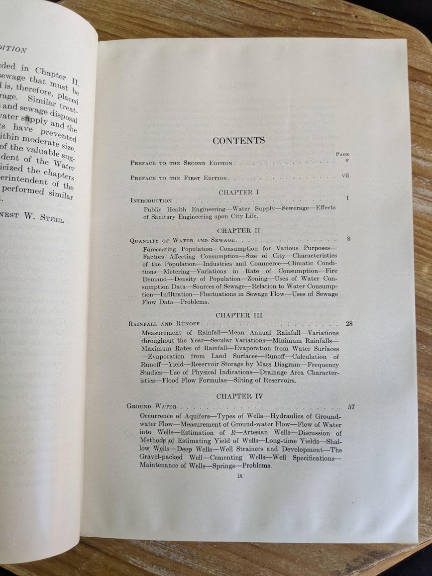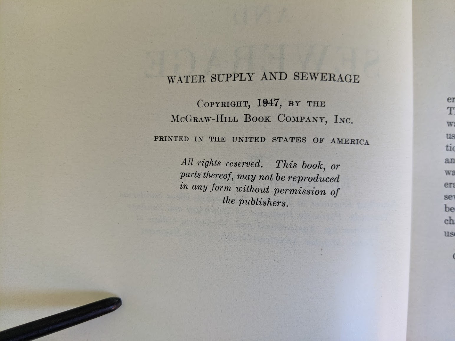 Water Supply and Sewerage by Ernest W. Steel. Published in 1947 by McGraw-Hill Book Company, Inc. Second Edition, 4th Impression.