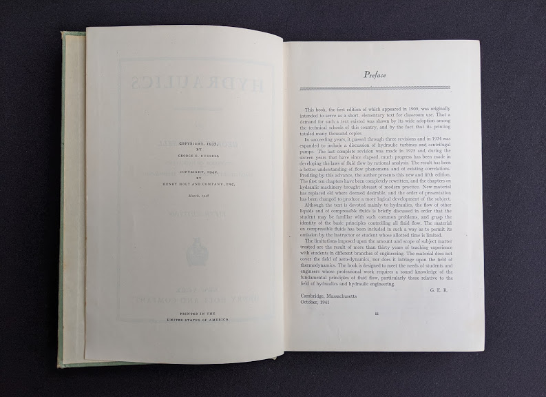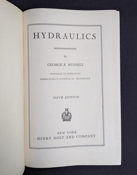 Hydraulics, by George E. Russell. Published in 1948 by Henry Holt and Company. 5th Edition copy.