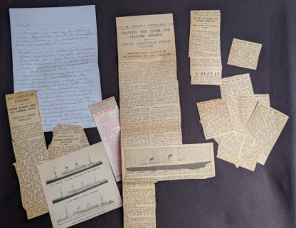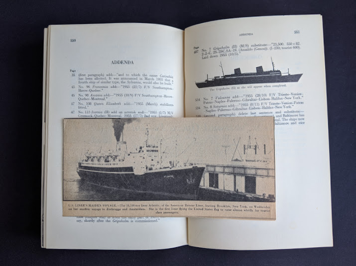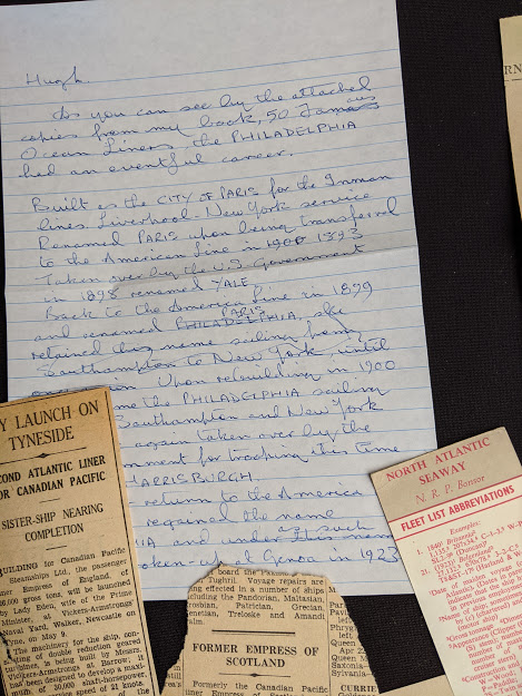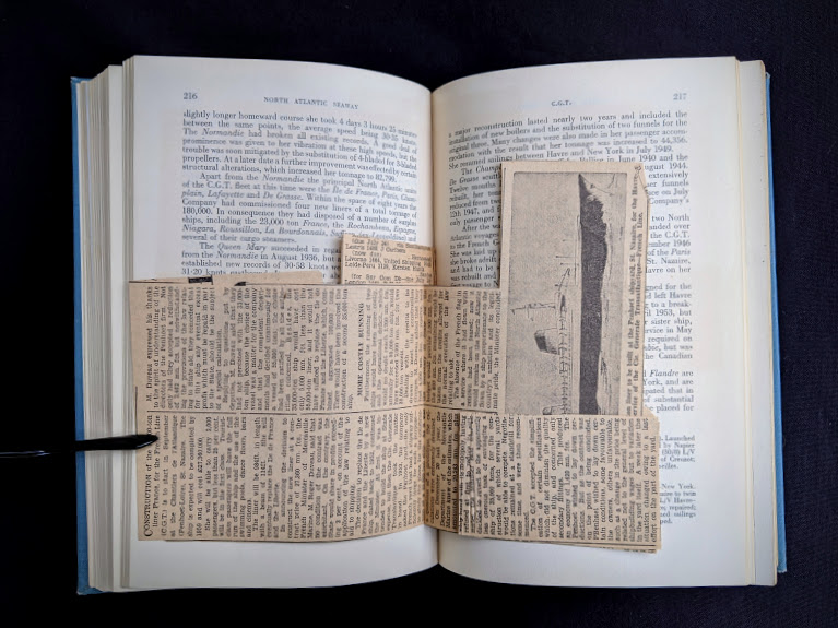 Ephemera inside include many newspaper clippings in relation to ships in the North Atlantic Seaway. There is also the first page of a handwritten letter written by another nautical author of a book titled; 50 famous liners, detailing some of the events of a ship named the Philadelphia. Likely this was the previous owner of the book.