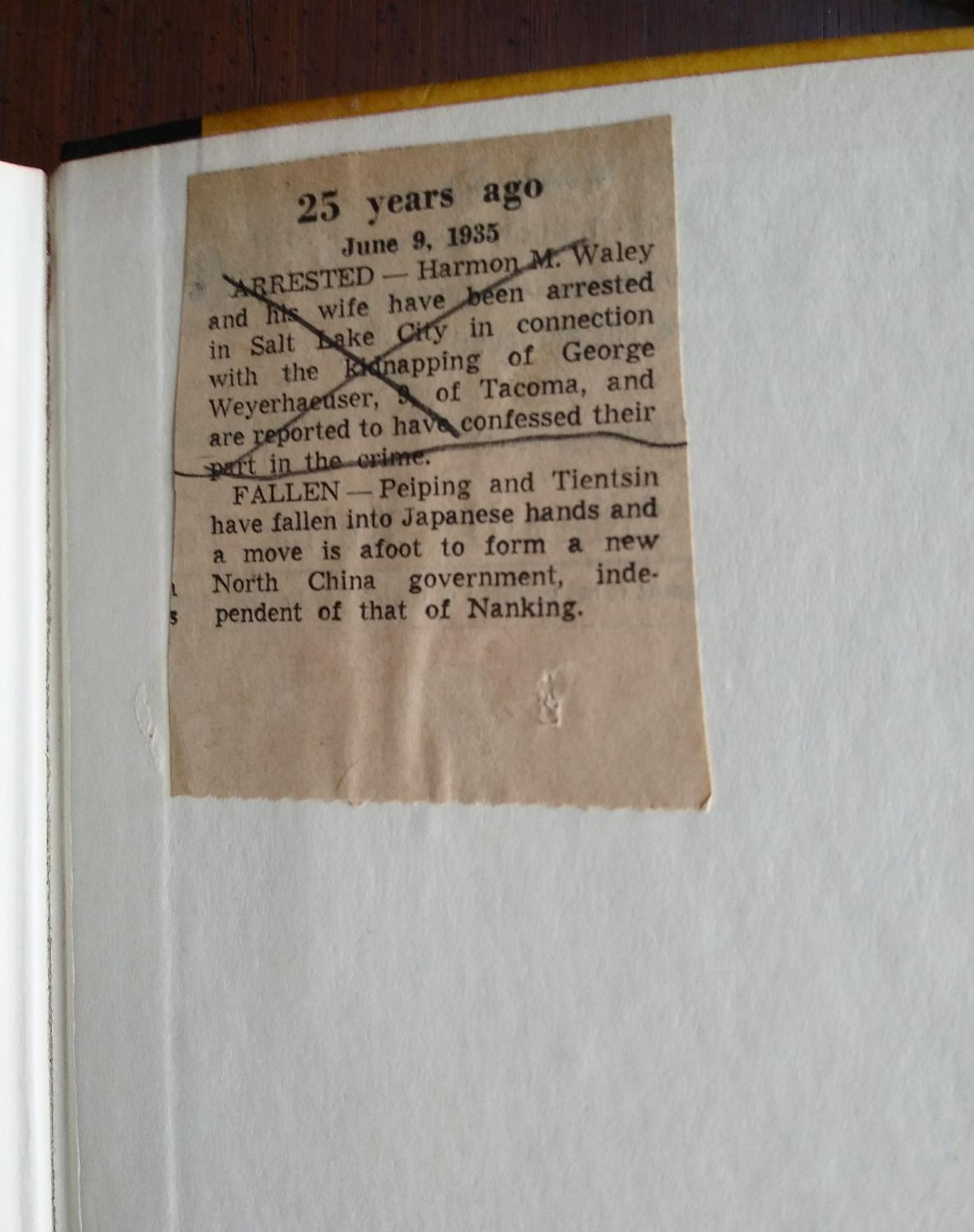 There is an interesting piece of ephemera in this book, left by a previous owner. It is a newspaper clipping pasted to the back paste down of the book, dated June 9, 1935, which reads;