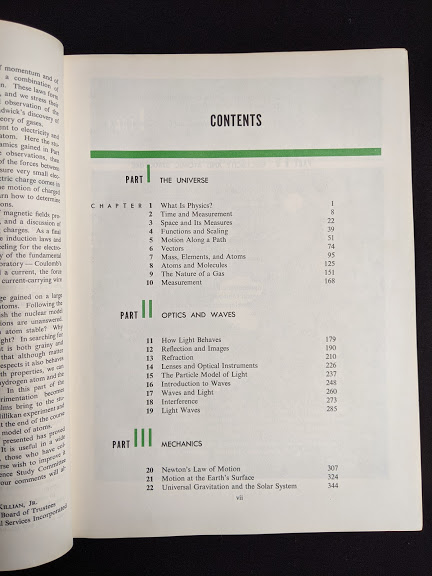 This 1960 first edition of Physics is almost certainly the textbook for which Abbott made her science pictures. Although the books stated publisher is D.C. Heath, it was produced under the aegis of the Educational Services, Inc. (ESI), Physical Science Coordinating Committee, which oversaw an enormous collaborative effort between scientists and academics on both the high school and college level. The book has no chief author, but credit for coordinating the project is given to Dr. Francis L. Friedman, a Professor of Physics at MIT.