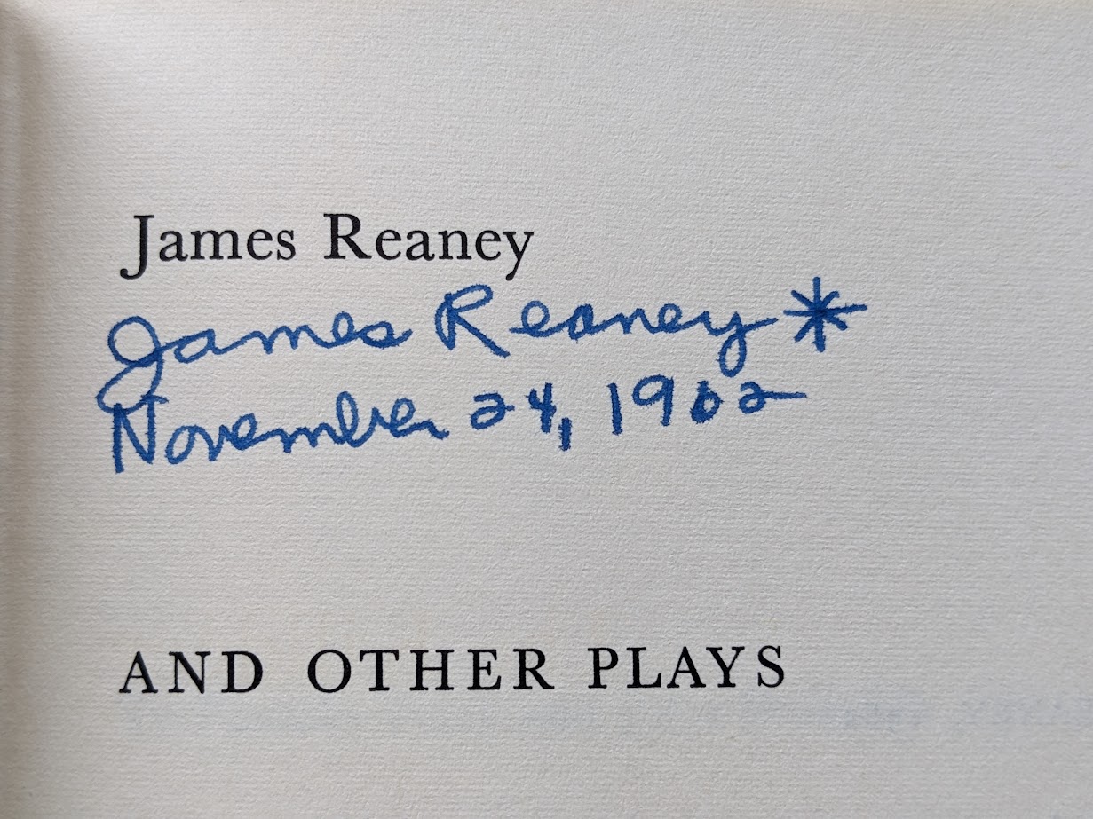 Title page with signature of Author – 1962 The Kildeer & other Plays by James Reaney – Signed by Author – First Edition Signature of James Reaney up close – 1962 The Kildeer & other Plays by James Reaney – Signed by Author – First Edition