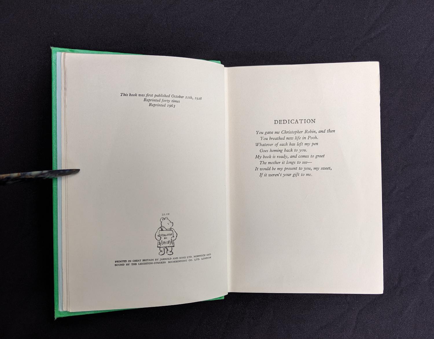 “This book was first published October 11th, 1928″ Reprinted forty times, Reprinted 1963”.