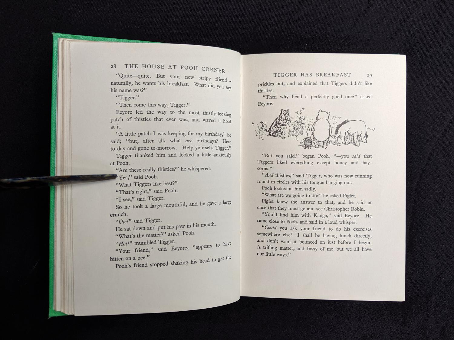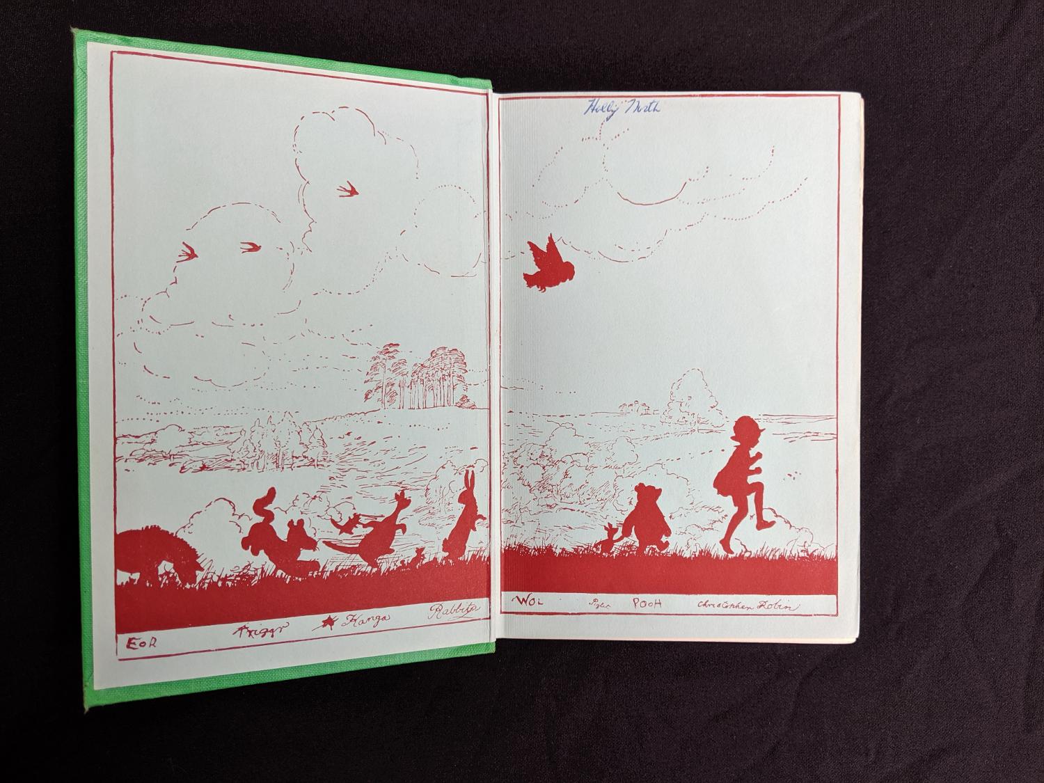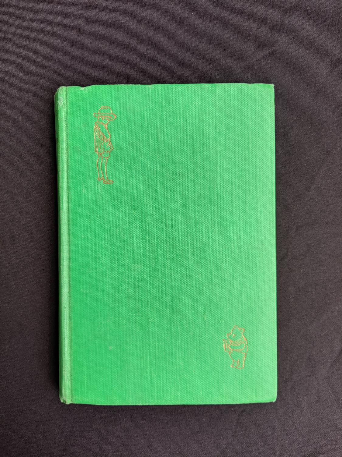 The green cloth binding is still a vivid green. There is a full split down hinge between the front pastedown and the pre-title leaf (see a picture included in the gallery area attached to this posting for an example of this). All 178 pages present secure to hinge and clean other than a previous authors name written on front endpaper. A charming copy with all of Ernest Shepards sketches on every other page throughout the entire book. The green cloth board is not particularly common copy.