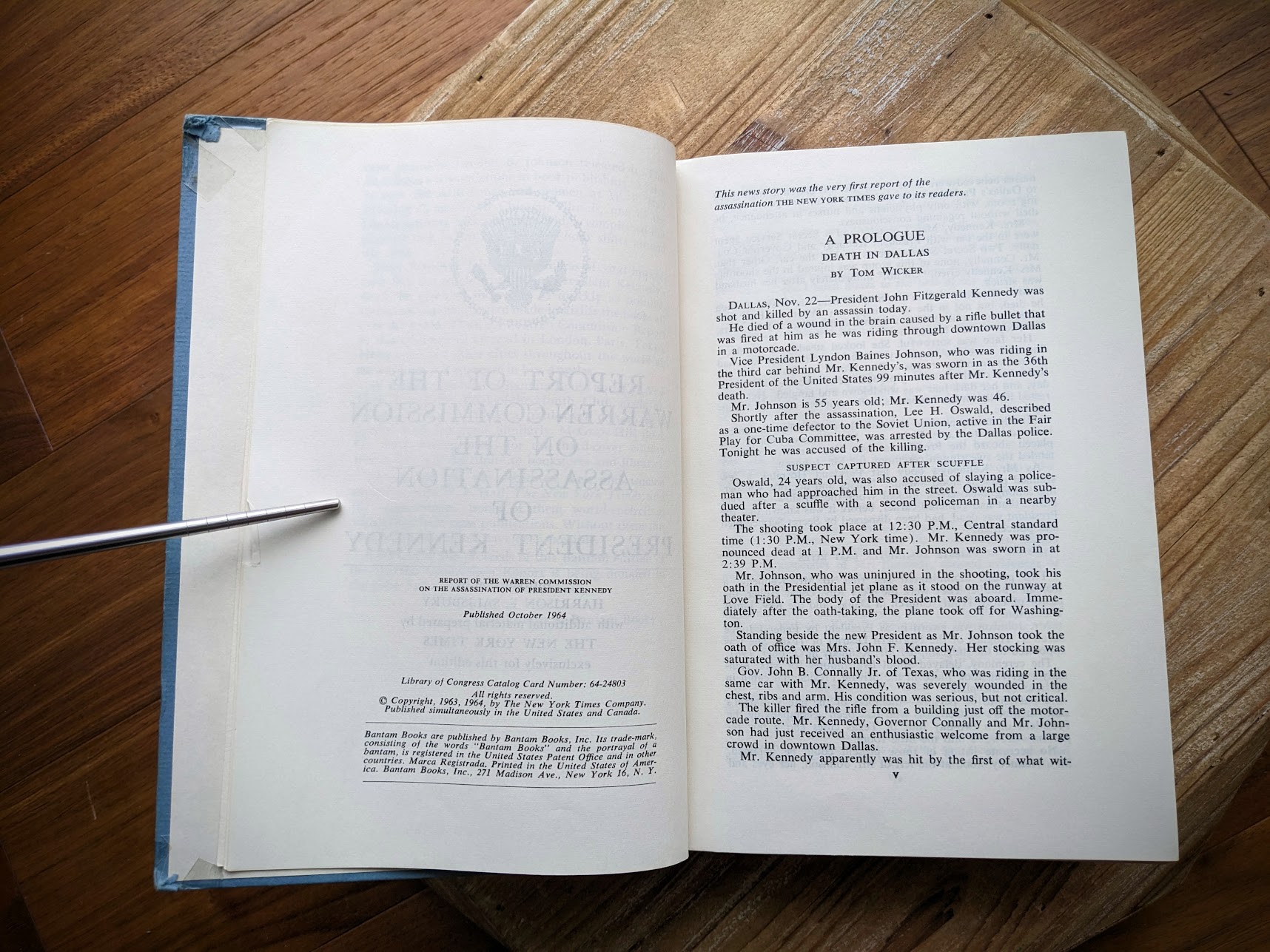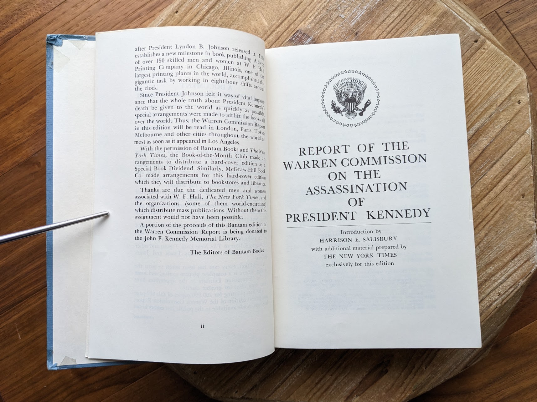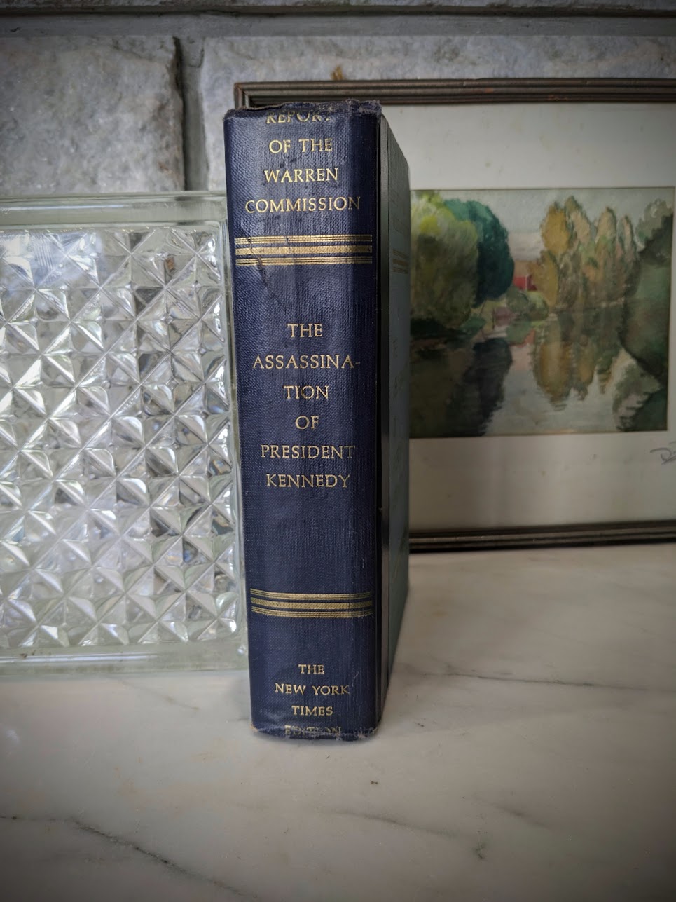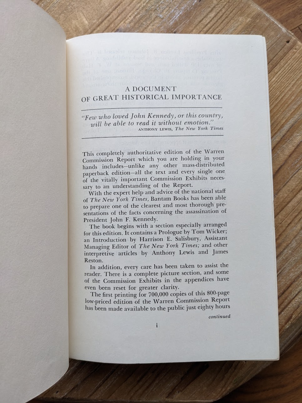 REPORT OF THE WARREN COMMISSION: The Assassination of President Kennedy. Copyright by The New York Times, published in 1964 by Bantam Book Inc. This is NOT a book club edition which has similar front and back panels. Ephemera inside (described below with images).