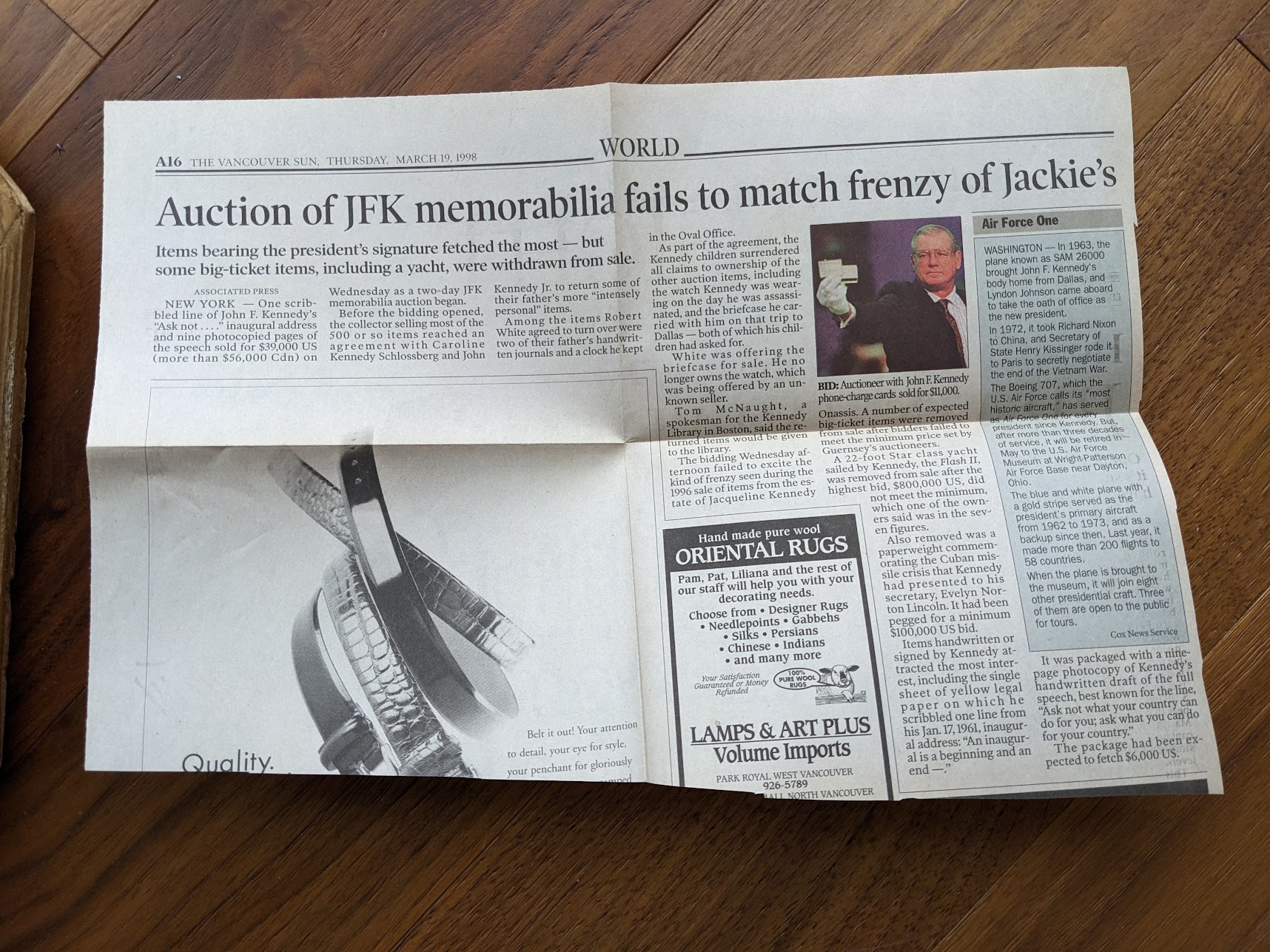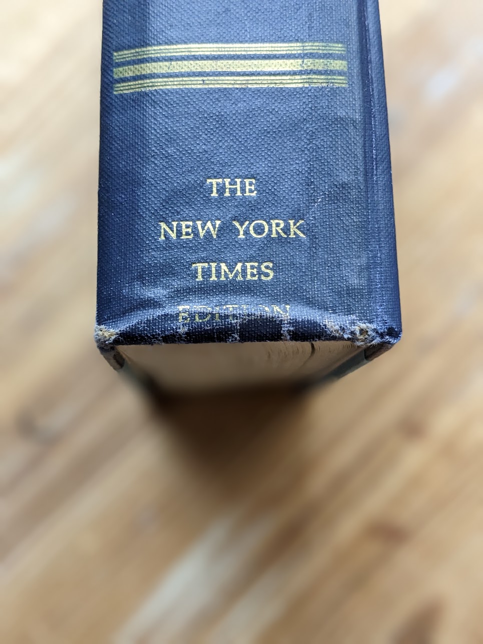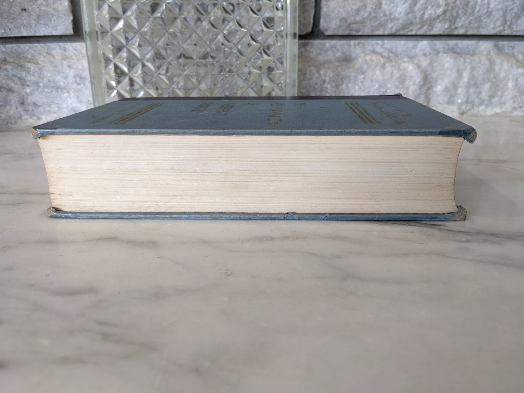 726 Pages secure to hinge with index in rear. Light Blue Covers With Black Spine; Gild Lettering On Front Cover And Spine. bumping wear to front and back panel edges (see pictures in gallery are for example of this); Pages Tight; no markings on pages. Ephemera found inside; a newspaper clipping from The Vancouver Sun dated March 19th, 1998 of an article entitled “Auction of JFK memorabilia fails to match frenzy of Jackie’s” (see ephemera unfolded in gallery area of this posting).