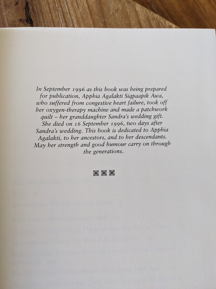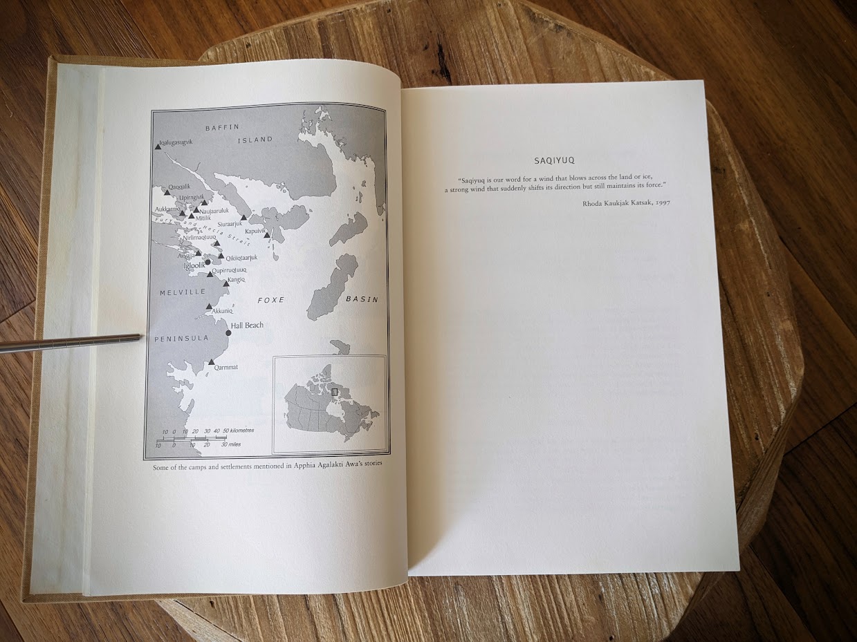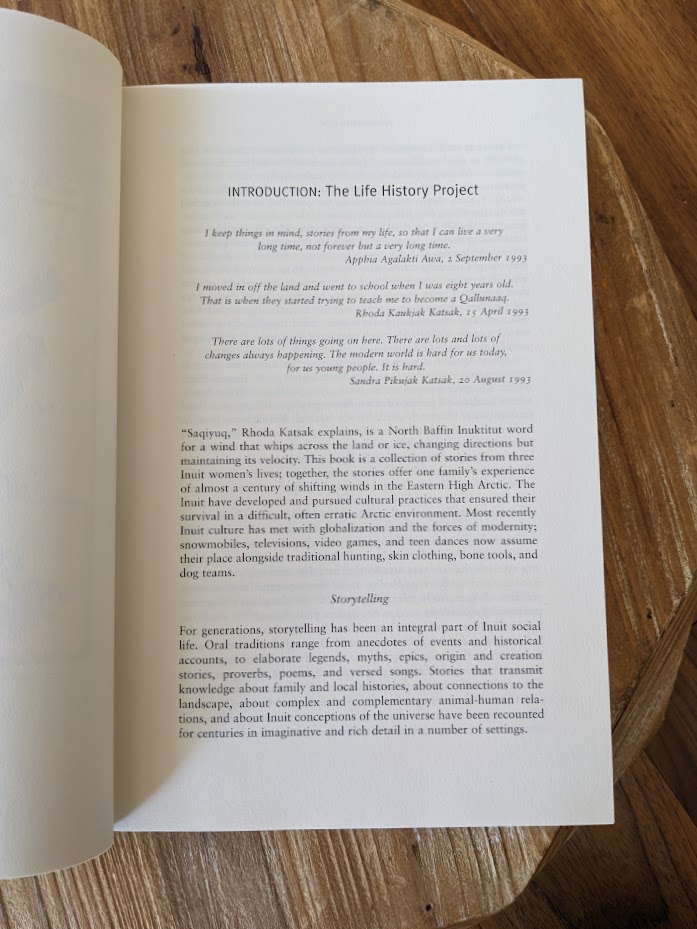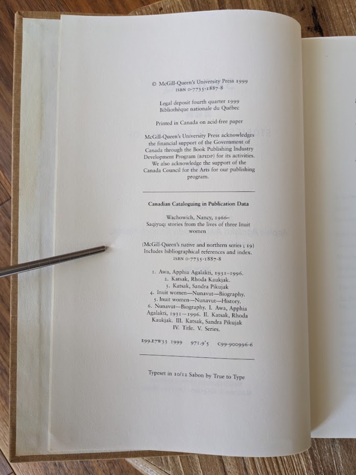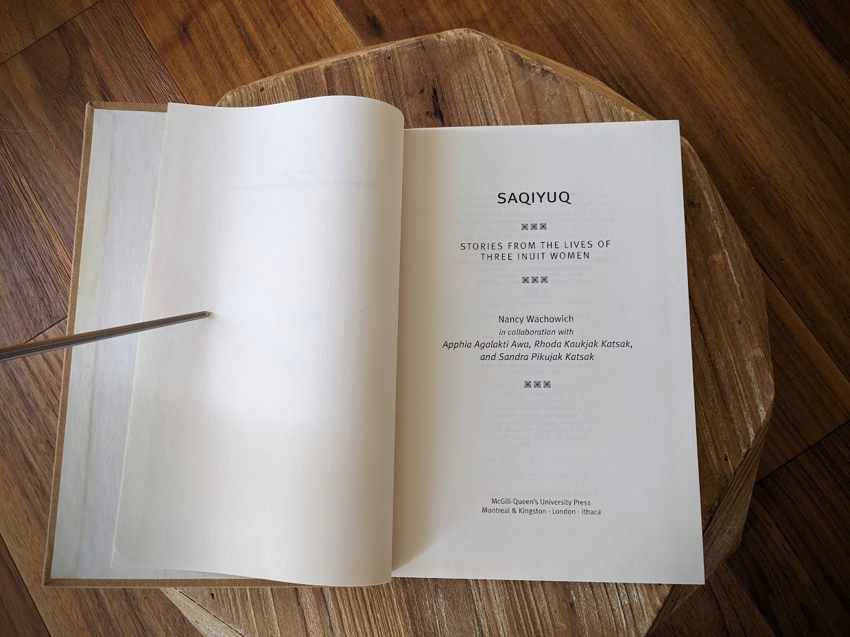 Saqiyug; Stories from the Lives of Three Inuit Women. Nancy Wachowich in collaboration with Apphia Agalakti Awa, Rhoda Kaukjak Katsak, and Sandra Katsak. Printed in 1999 by McGill-Queen’s University Press. First Edition.